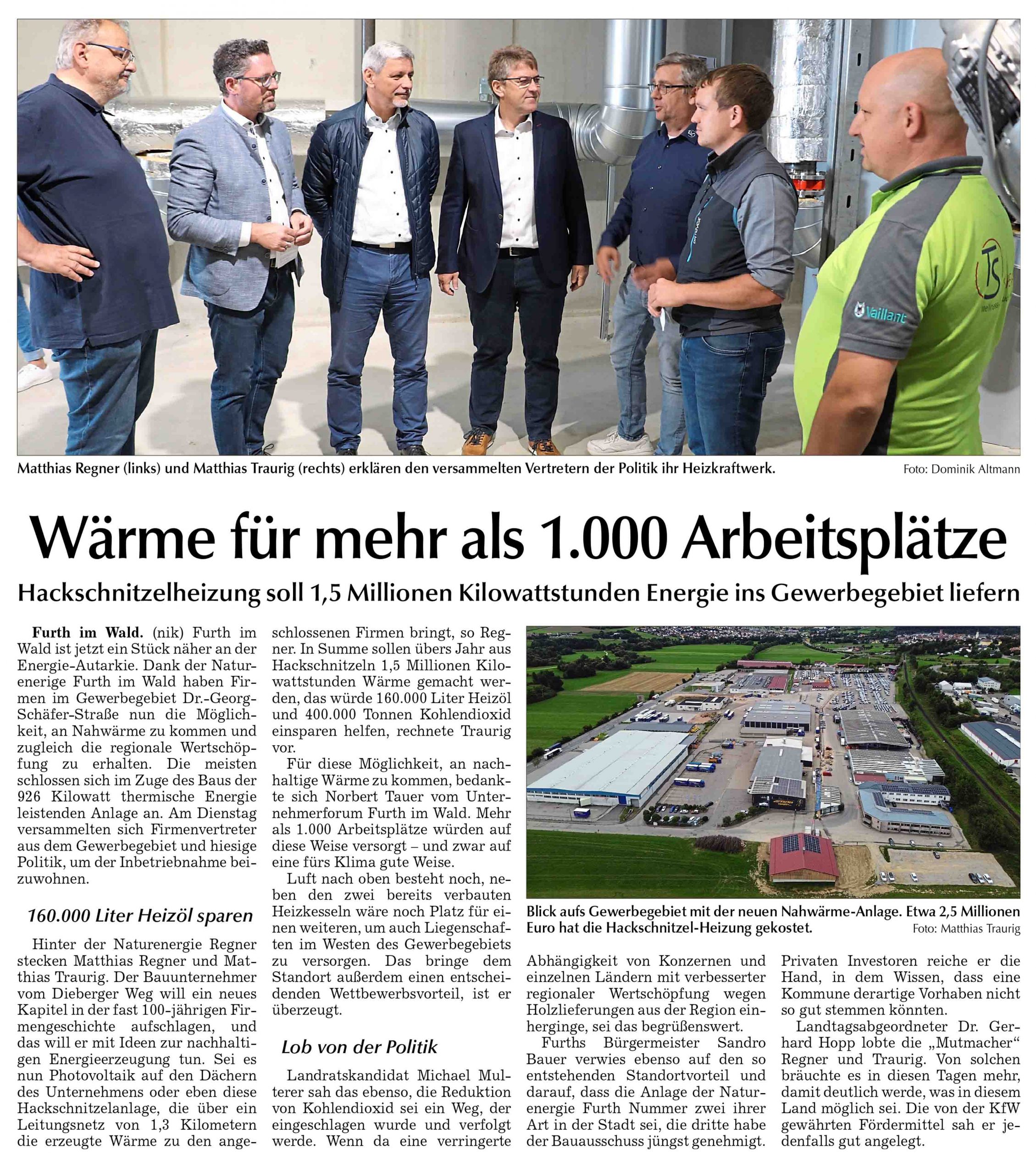 Lob von der Politik Landratskandidat Michael Multerer sah das ebenso, die Reduktion von Kohlendioxid sei ein Weg, der eingeschlagen wurde und verfolgt werde. Wenn da eine verringerte Abhängigkeit von Konzernen und einzelnen Ländern mit verbesserter regionaler Wertschöpfung wegen Holzlieferungen aus der Region einherginge, sei das begrüßenswert. Furths Bürgermeister Sandro Bauer verwies ebenso auf den so entstehenden Standortvorteil und darauf, dass die Anlage der Naturenergie Furth Nummer zwei ihrer Art in der Stadt sei, die dritte habe der Bauausschuss jüngst genehmigt. Privaten Investoren reiche er die Hand, in dem Wissen, dass eine Kommune derartige Vorhaben nicht so gut stemmen könnten. Landtagsabgeordneter Dr. Gerhard Hopp lobte die „Mutmacher“ Regner und Traurig. Von solchen bräuchte es in diesen Tagen mehr, damit deutlich werde, was in diesem Land möglich sei. Die von der KfW gewährten Fördermittel sah er jedenfalls gut angelegt.
