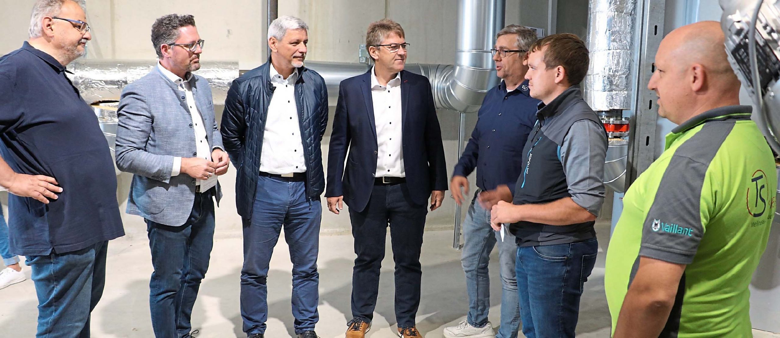 Matthias Regner (links) und Matthias Traurig (rechts) erklären den versammelten Vertretern der Politik ihr Heizkraftwerk.